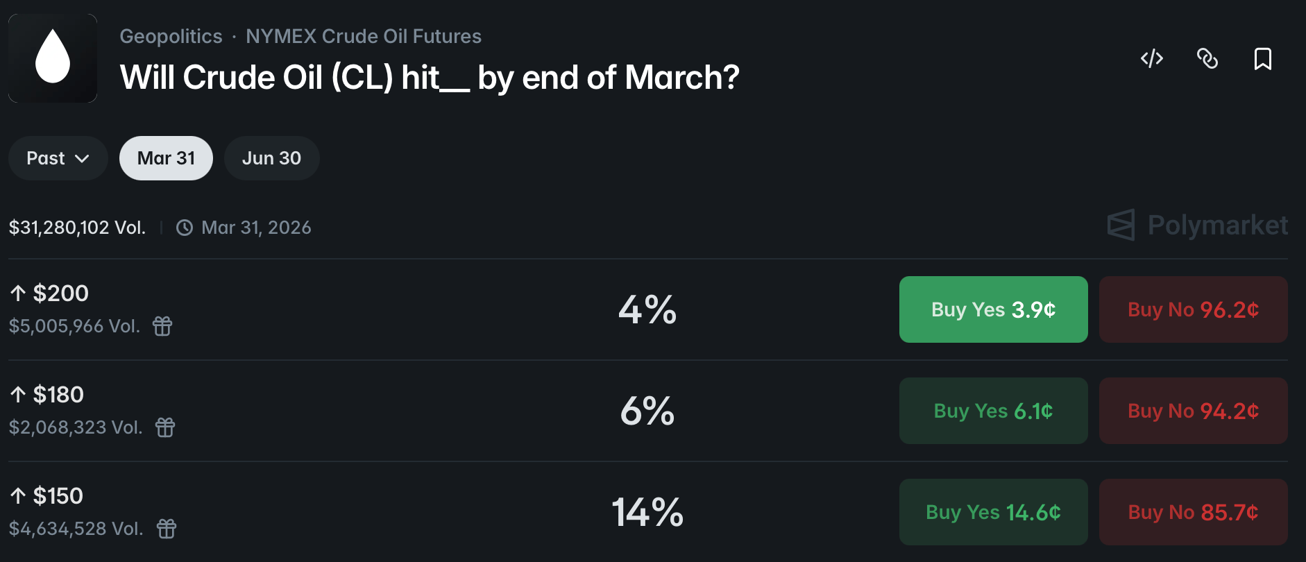 Bettors on Polymarket are predicting what will crude oil hit by end of March?