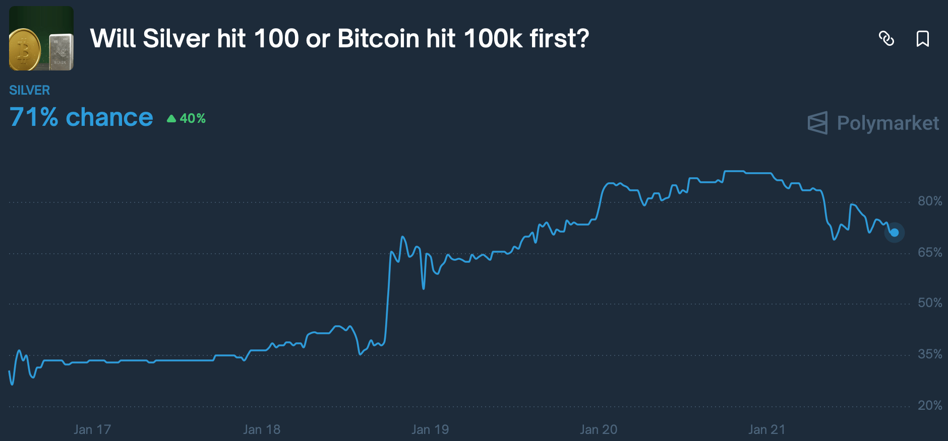 Bettors on Polymarket are predicting will Silver hit 100 or Bitcoin hit 100k first?