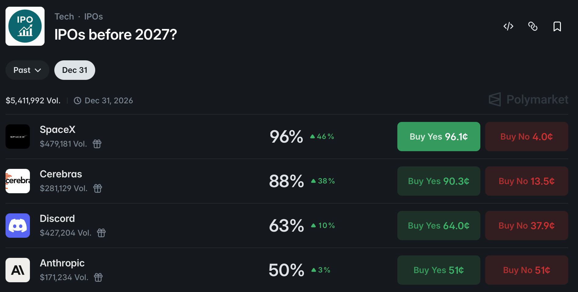 Bettors on Polymarket are predicting IPOs before 2027?
