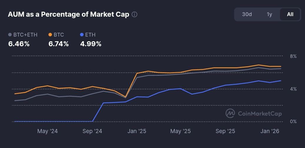 ETFs now hold around 6.5% of Bitcoin and Ethereum
